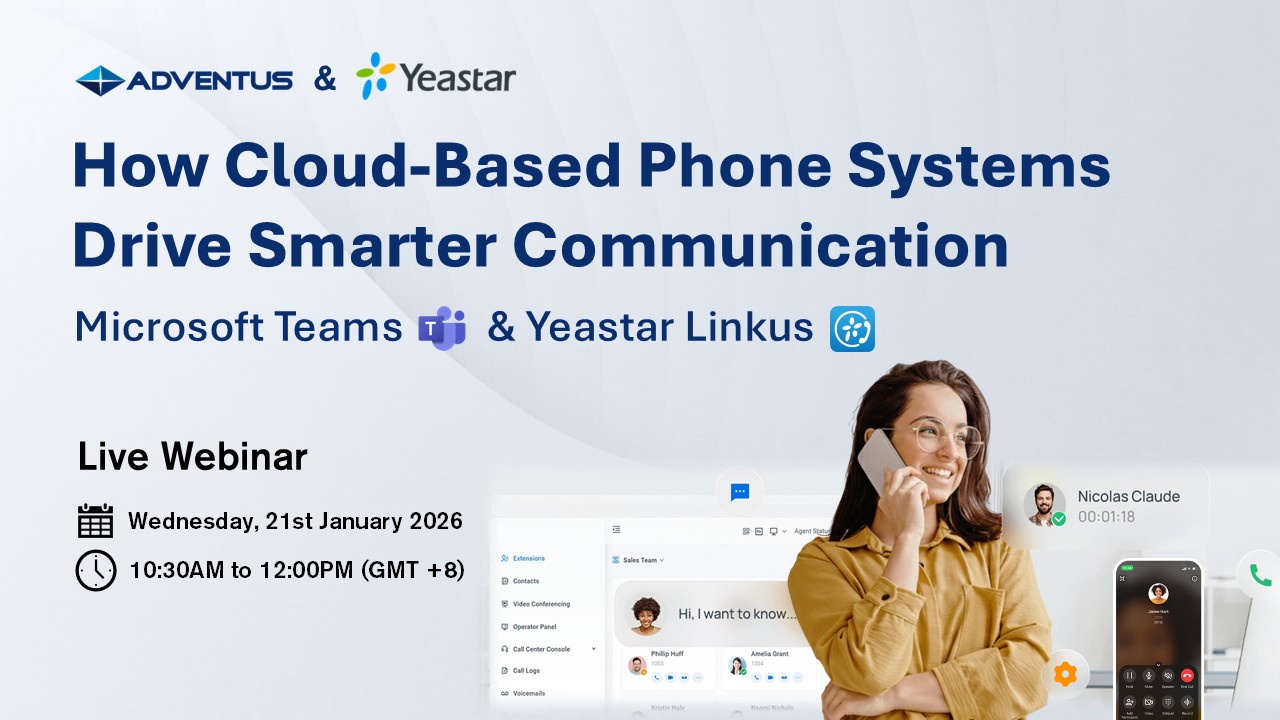 On 21st January 2026, Adventus & Yeastar hosted a joint webinar with the topic: "How Cloud-Based Phone Systems (Microsoft Teams and Yeastar) Drive Smarter Communication". Our experts focused on how Cloud-based platforms such as Microsoft Teams Phone and Yeastar’s P-Series Cloud Edition help deliver unified communications in a streamlined, easy-to-manage format for SMBs and enterprises alike.